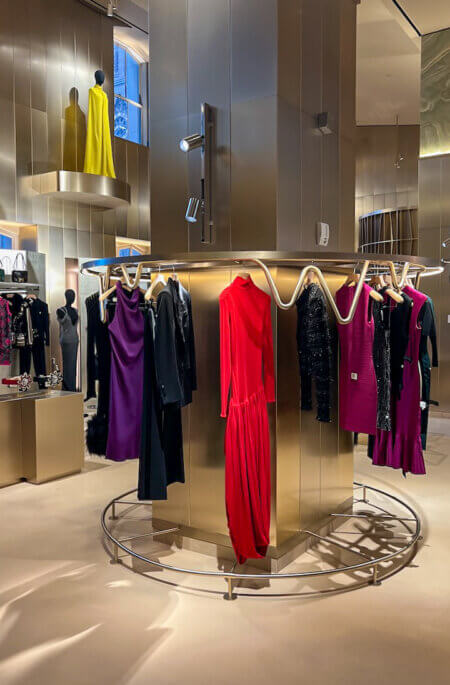 But I digress, back to the store. After a quick, albeit confusing perusal on that floor, I ascended the elevator to level two, which is the top floor of the store. This floor has a stunning bar, and various clothing areas for both men and women. But how are they divided? Just mixed? It wasn’t clear to me. Most collections are housed in these sorts of circular floral cages. Yes, the hand painted walls and floors are amazing, but was this all the store offered?