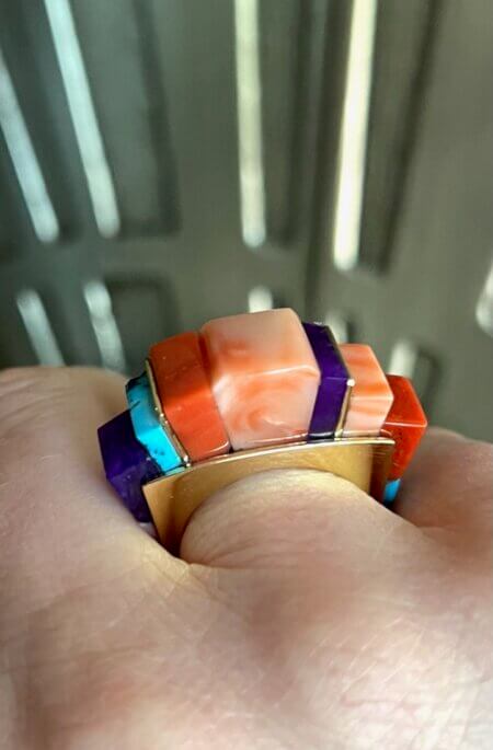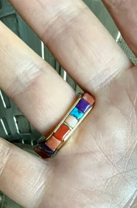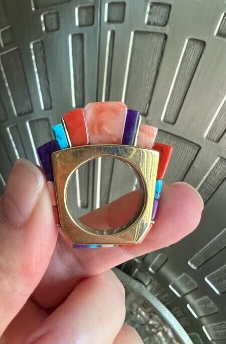 I couldn’t neglect my fingers, so this 18K ring with sugilite, coral, and turquoise was calling my name. This stunner was made by 5th generation jeweler, Melvin Platero. This ring was inspired by Charles Loloma, one of my all-time fave Native American jewelry designers.