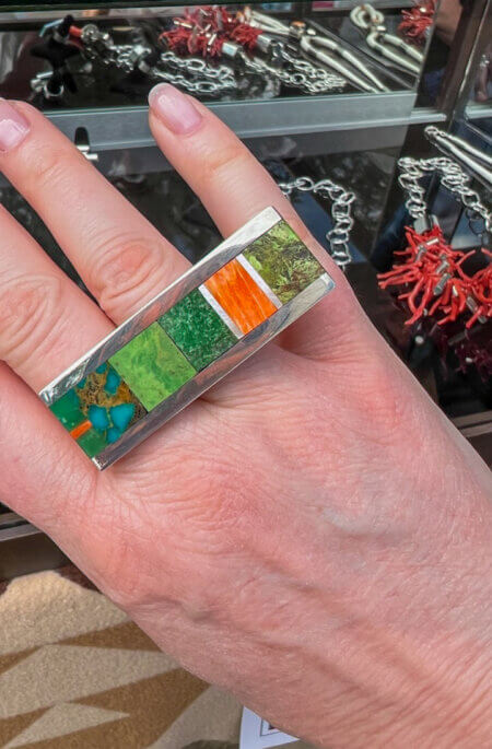 Although I was initially looking for gold jewelry, I was quite instantly equally interested in the silver works as well. You know I love mixing metals!! Given my personal style, I was also looking for pieces that I refer to as “Indian adjacent” or “Indian light.” I already have a few more traditional squash blossom necklaces, so this time I was on the hunt for items that could mix well with my antique and mid-century pieces, creating looks that I could easily wear anywhere from San Francisco to Milan.